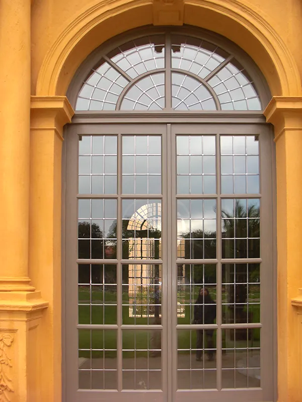 Modernisierung der Fenster durch Isolierglas mit Wärmedämmung. Umsetzung eines historischen Erscheinungsbildes durch präzise Anpassung an die bestehende Architektur der Orangerie durch Anbringen von Bleisprossen.