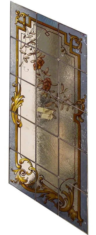 Für eine Jugendstilvilla in Bamberg haben wir mehrere historische Bleiverglasungen und Glasmalereien restauriert. Das Ensemble bestand aus einer elliptischen Verglasung, drei halbrunden Oberlichtern und vier parallelogrammförmigen Fenstern. Jedes Element zeigte eigene Schadensbilder, die wir mit passenden restauratorischen Maßnahmen behoben haben.