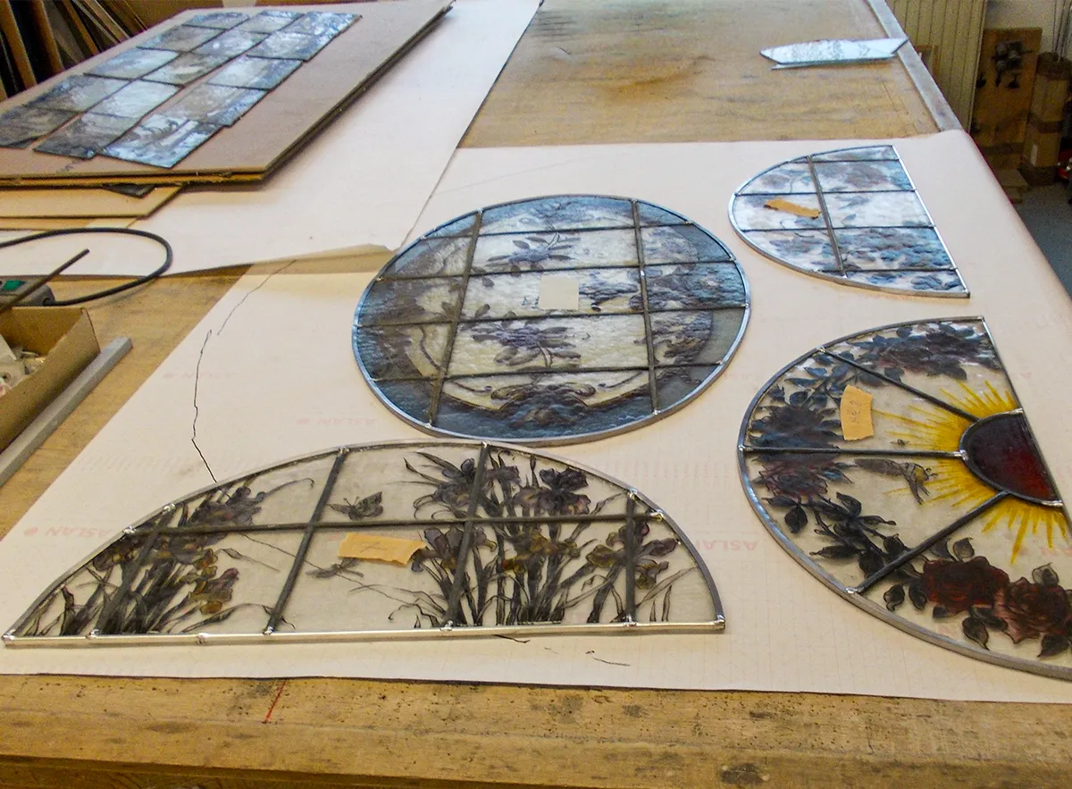 Restaurierung von Bleiglasfenstern und Glasmalerei einer Jugenstilvilla in ovaler, halbrunder und parallelogramm Form